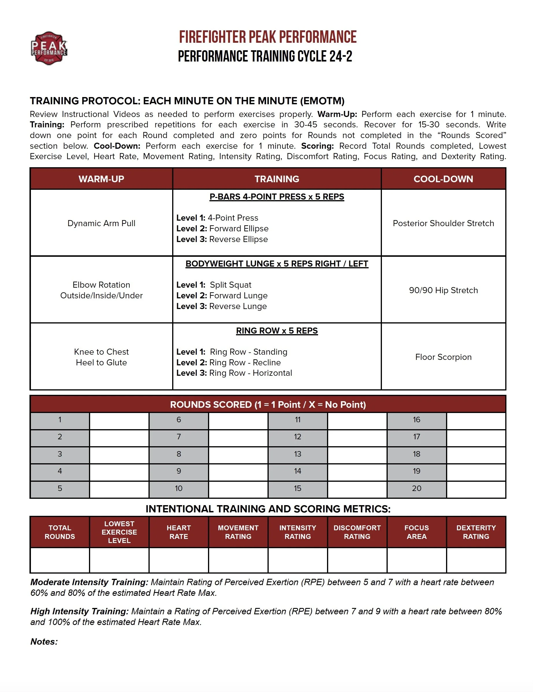 Here is your EMOTM Score Sheet for Moderate and High Intensity Training for your “CRACKYL Tactical Workout 24-2” featured in issue #13 and “Performance Training Cycle 24-2” in your Free Membership: