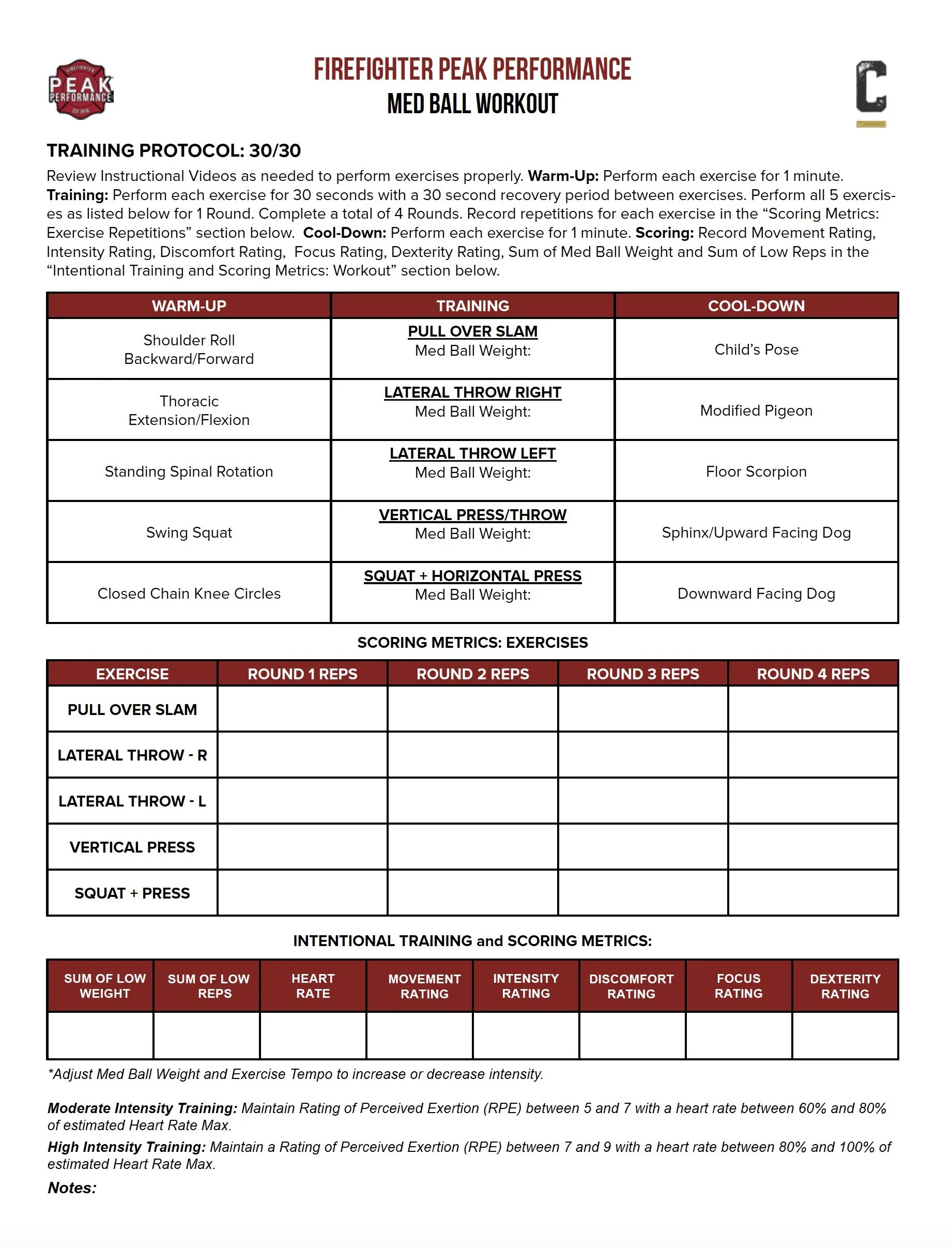 On the score sheet provided in your Med Ball Workout PDF, you will track: