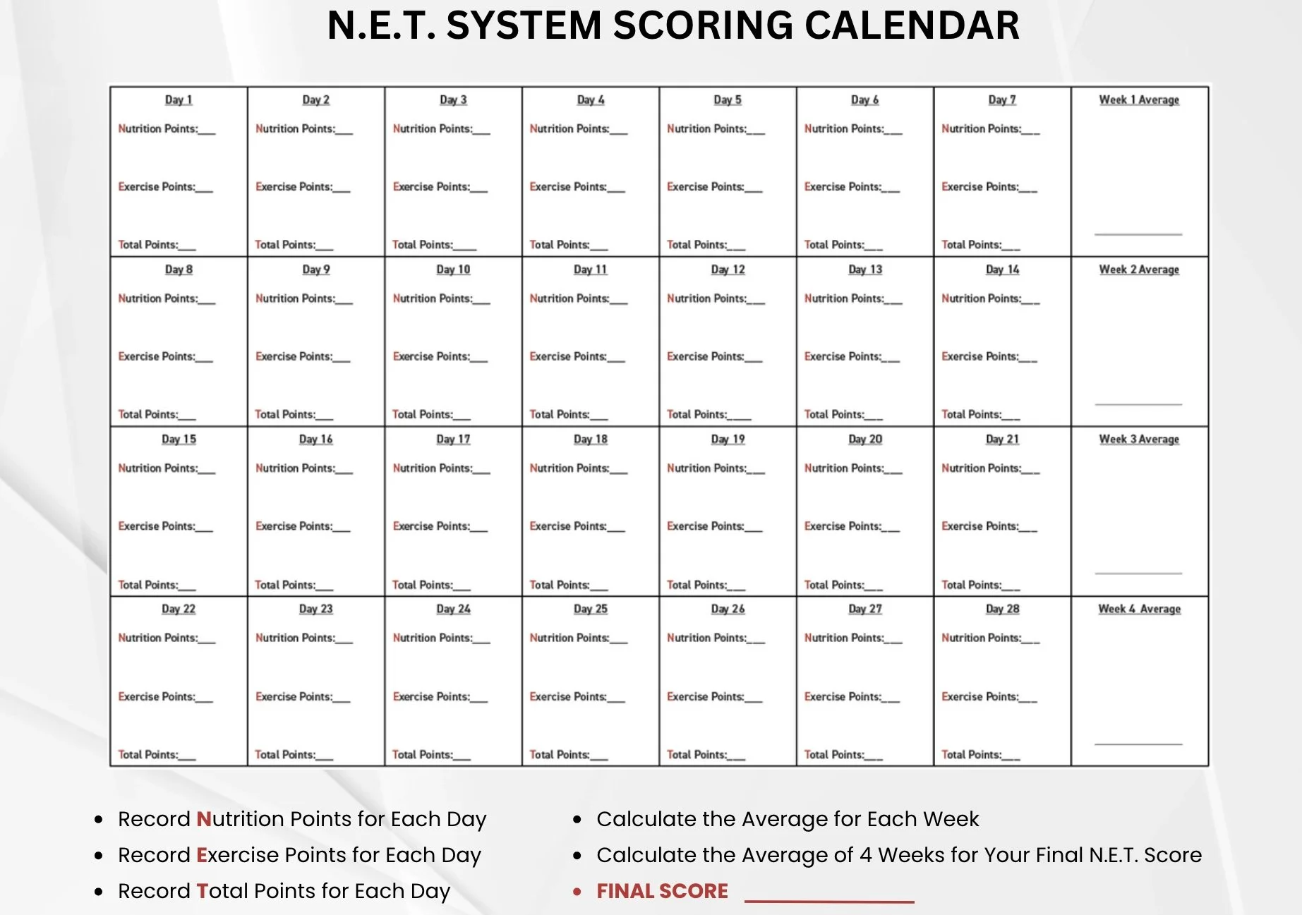 N.E.T. System 4-Week Scoring Calendar